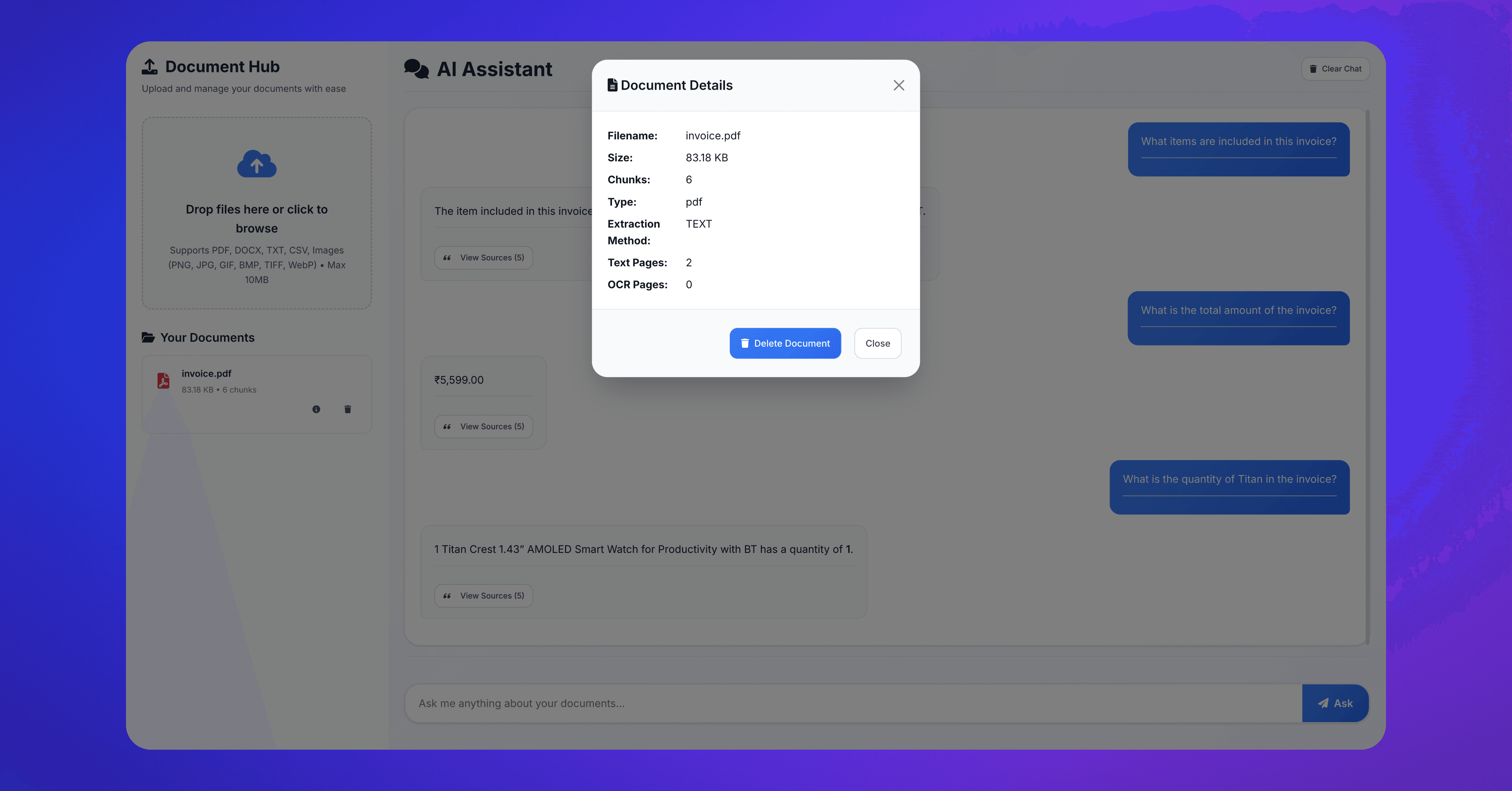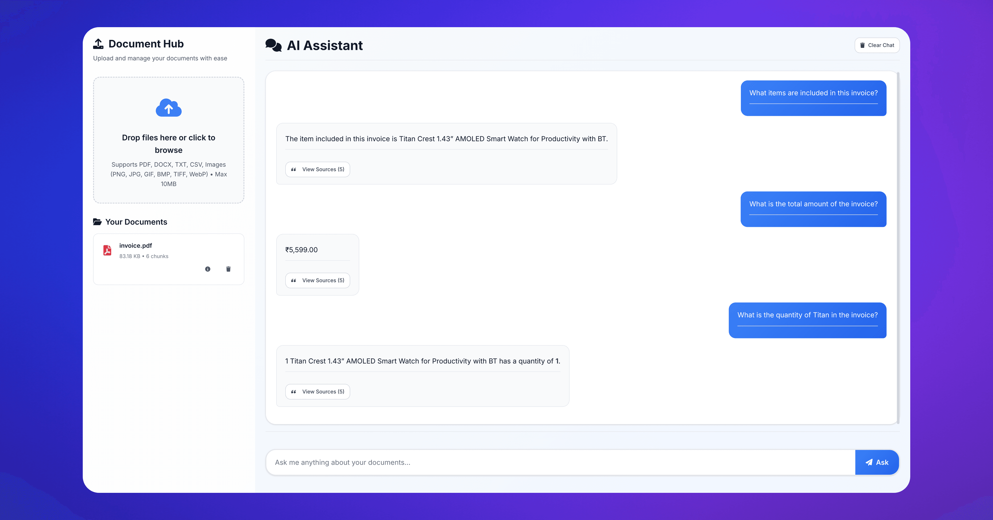 Unified Q&A over mixed formats: Ask questions across PDFs, docs, spreadsheets, and images without converting or preprocessing.