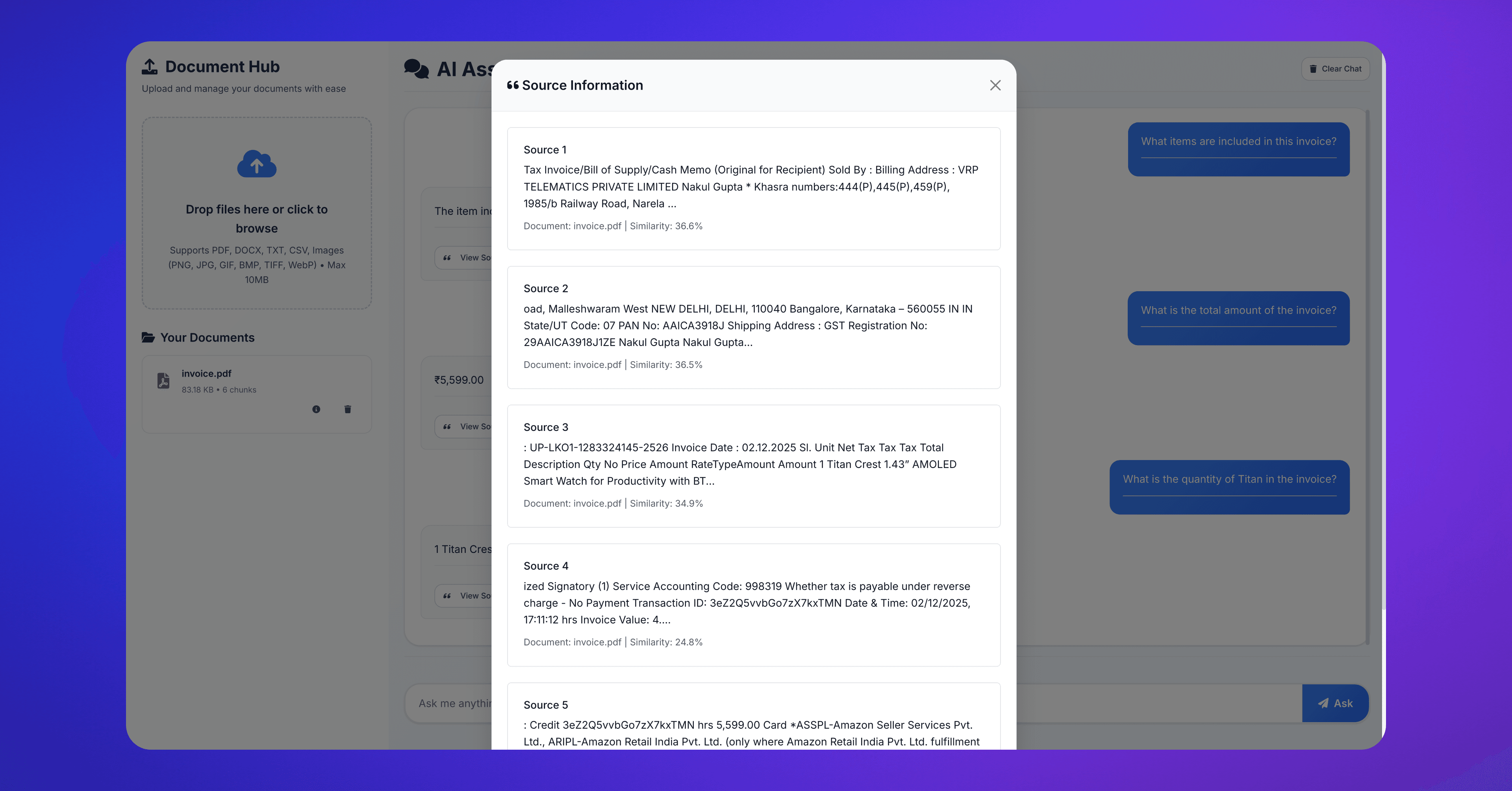 When the user asks a question, the system embeds the query and retrieves the top-matching chunks.