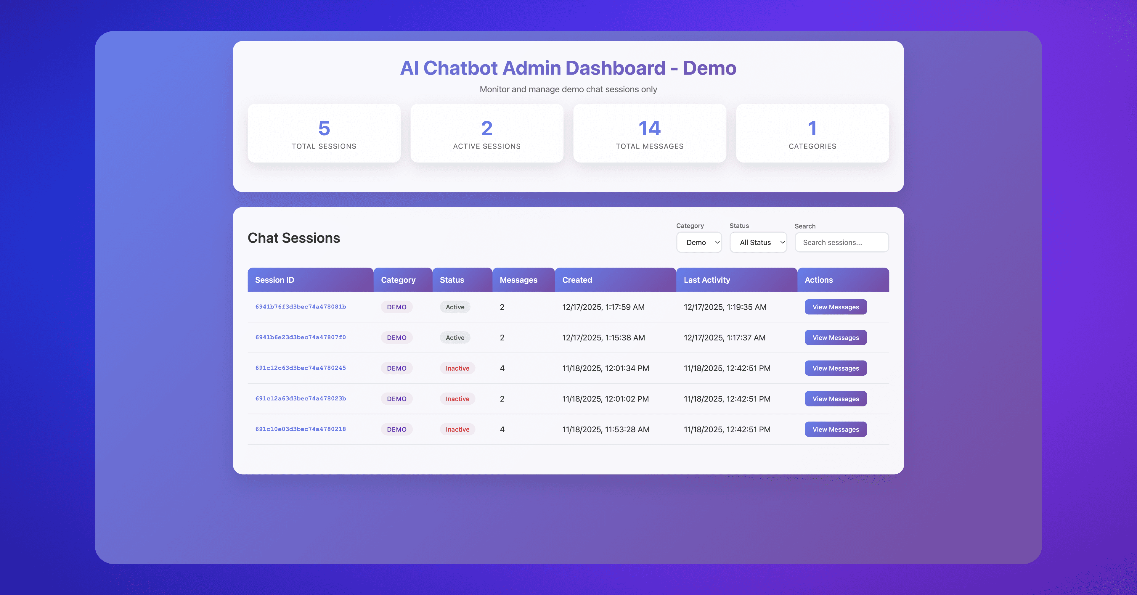 Admin dashboards surface session lists, message histories, and high-level statistics in near real time.